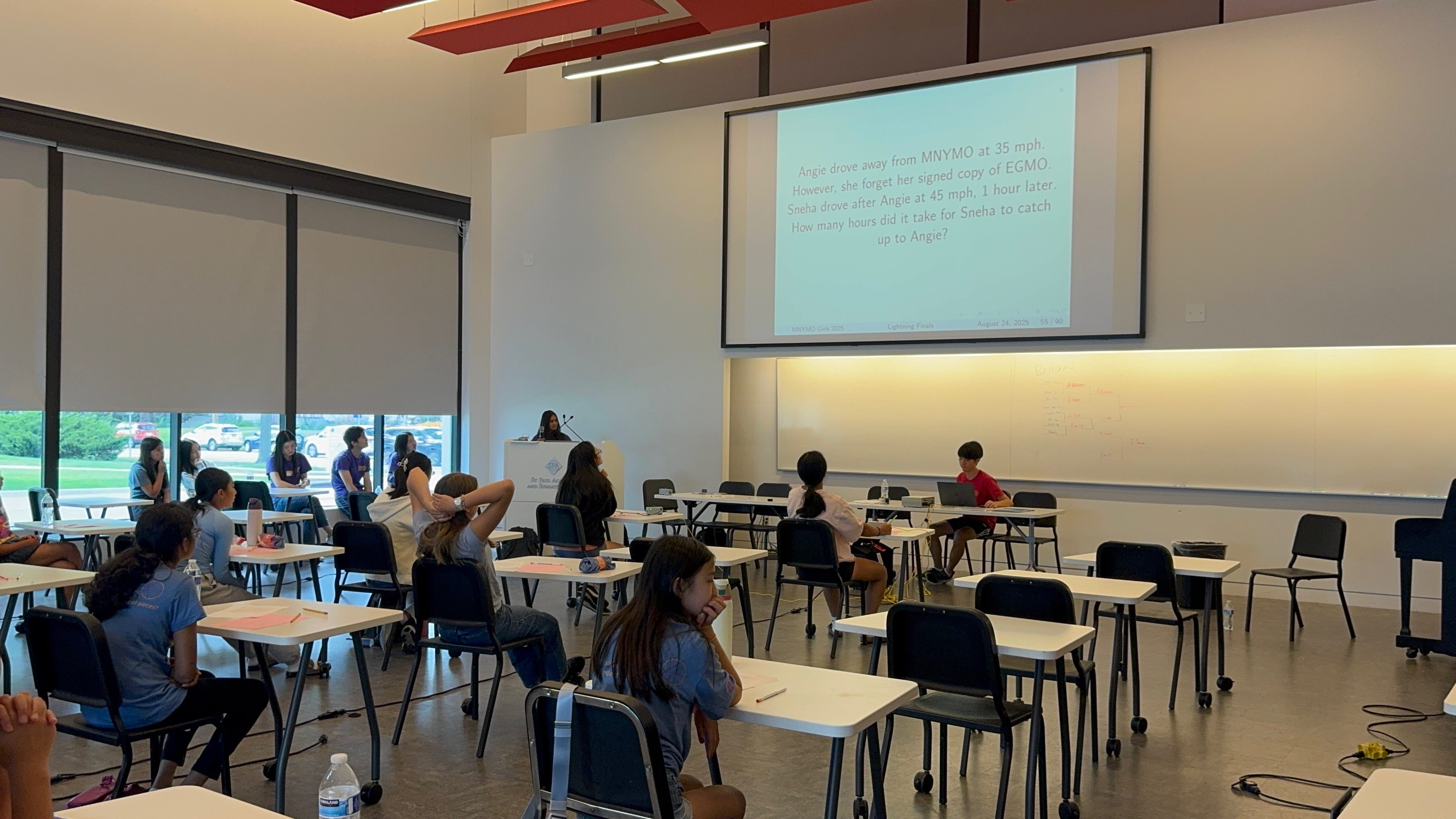 - Lightning Round: The top individuals will compete two-at-a-time in a double-elimination-style bracket tournament. For each match, a problem will be read and projected and the students will have 60 seconds to solve the problem. When a student has an answer ready, they may buzz in and answer and time is paused. If it is correct, they gain a point. If it is incorrect, time is resumed and the other student will have the remainder of the time to buzz in and answer. The first student to two points wins the match, and this process is repeated until a first-place winner is decided.